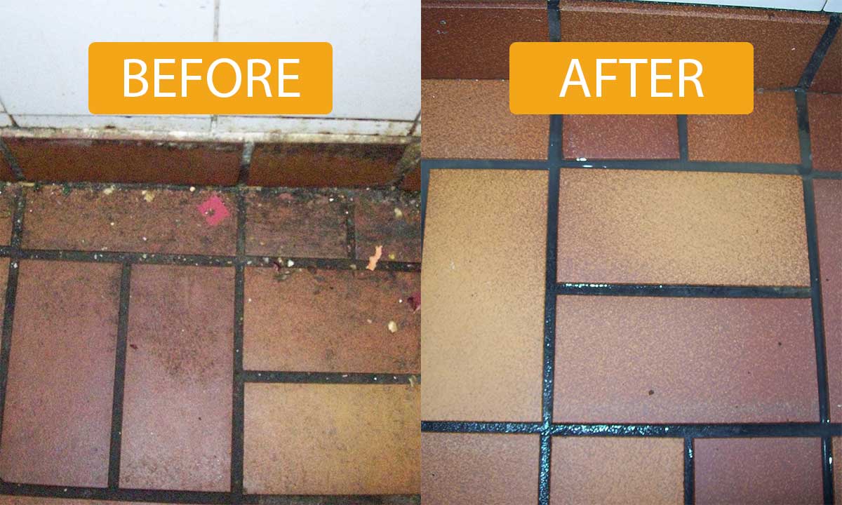 To properly clean kitchen tile floors, a mop is not enough. Grout is very porous and as a result, it will absorb all of the grease and dirt which is what makes your grout lines go dark.